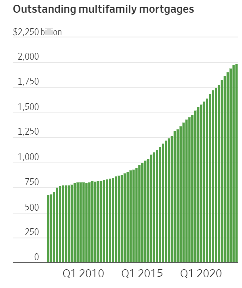 Outstanding multifamily mortgages more than doubled over the past decade to about $2 trillion, according to the Mortgage Bankers Association. That is nearly twice the amount of office debt, according to Trepp. The data provider adds that $980.7 billion in multifamily debt is set to come due between 2023 and 2027…