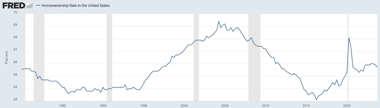 The official homeownership rate is down from the last bubble, but still higher than 30 years ago. I looked up how they calculate the number: “The homeownership rate is computed by dividing the estimated total population in owner-occupied units by the estimated total population”