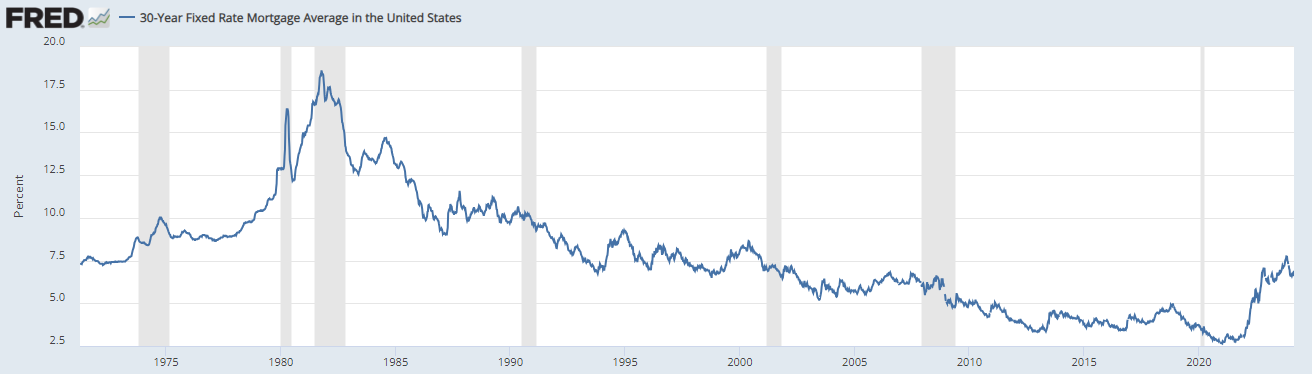 Since 1971, the average 30-year fixed rate has been 7.71%, and the median 7.38%. Freddie Mac below says we’re currently at 6.90%.