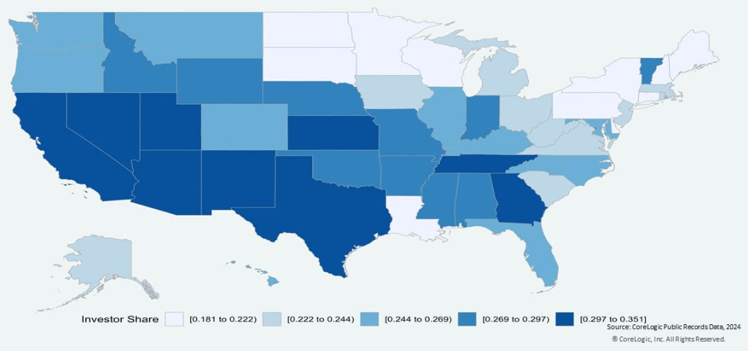 “Home investor shares for 2023 by state. California (35%), Georgia (34%), New Mexico (33%), Kansas (32%), Texas (31%), Nevada (31%), Arizona (30%), Tennessee (30%) and Utah (30%) were the states with investor shares at 30% or higher. “
