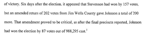 The LBJ story is an excerpt from Robert Caro's first LBJ book. A phenomenal read. That isn't even the craziest story...Brown and Roots funding of LBJ makes election rigging look like petty theft.
